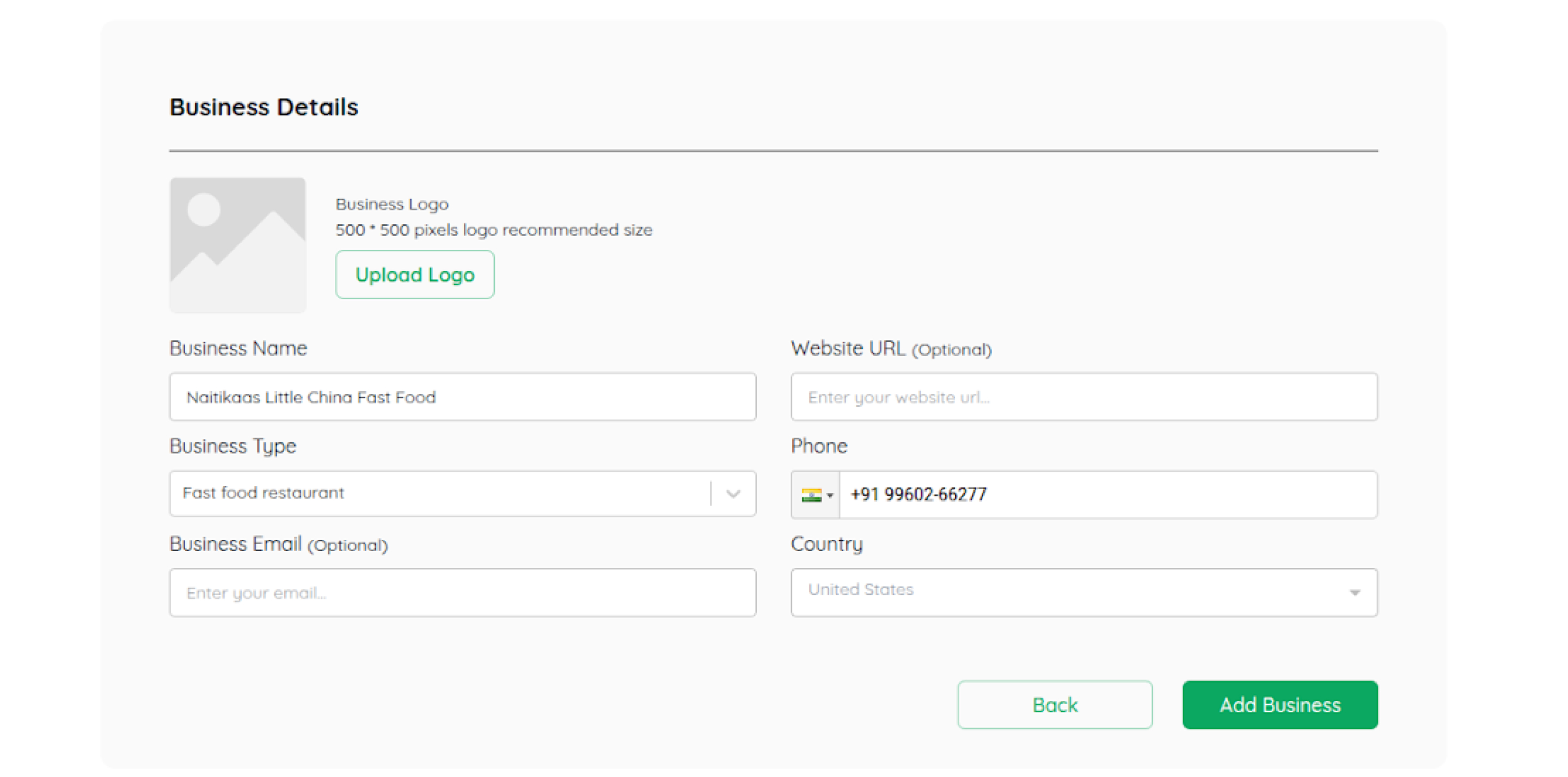 - You’ll be directed to the business details page, where you can fill in essential information such as your business logo, name, type, phone number, country, business email, and website URL.