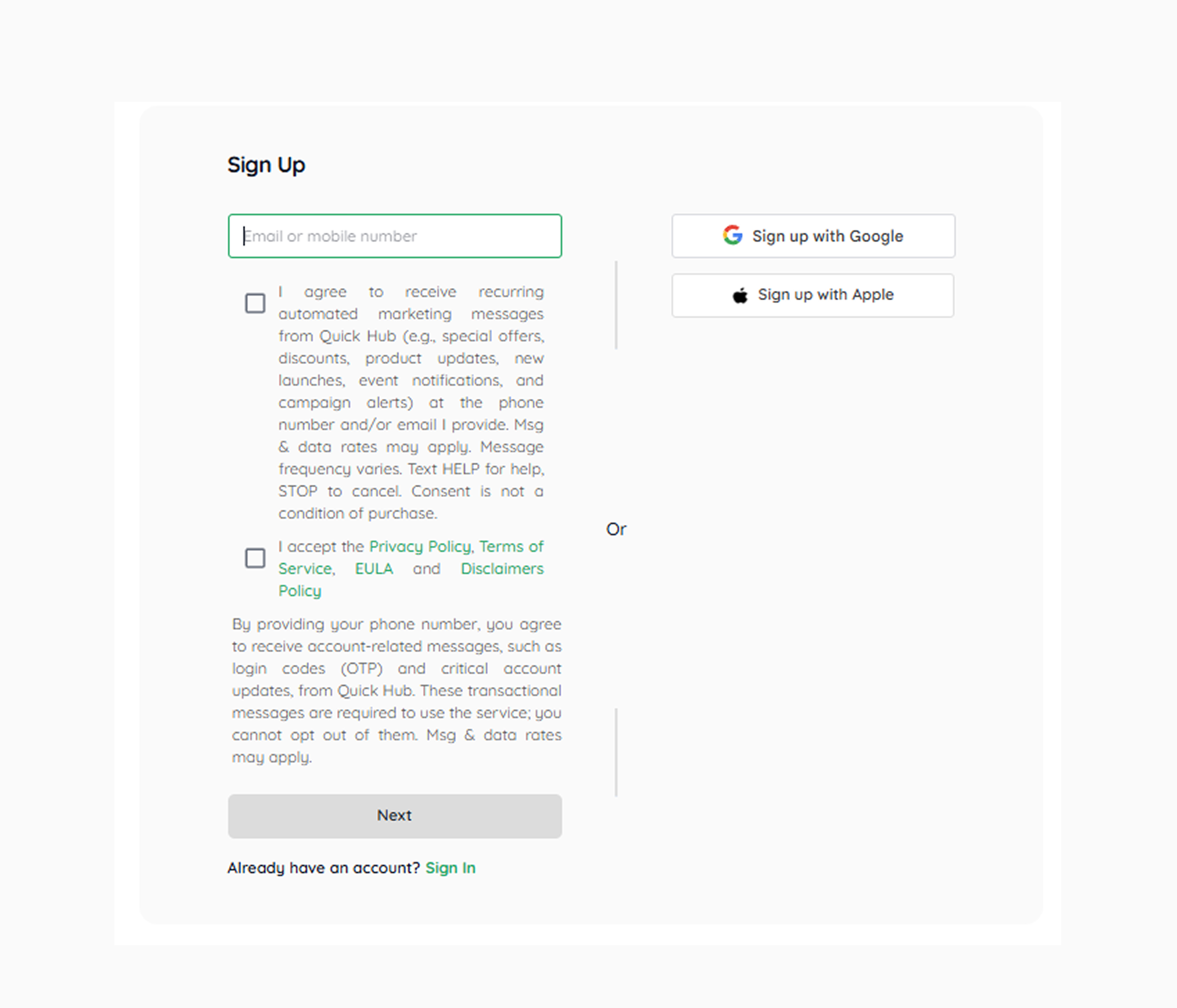 - Open the Quick Hub app on your device, or navigate to the Quick Hub (quickhub.ai) login page in your browser.