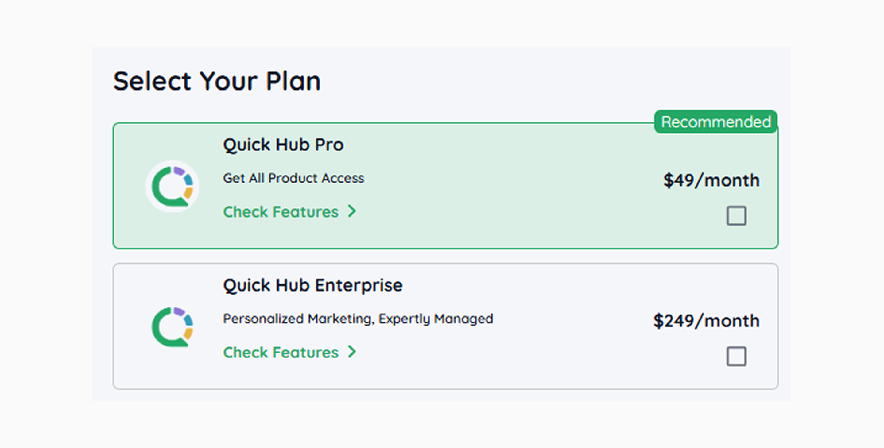 Select your ‘Plan’. Based on your requirements, you can choose from Quick Hub Pro or Quick Hub Enterprise.