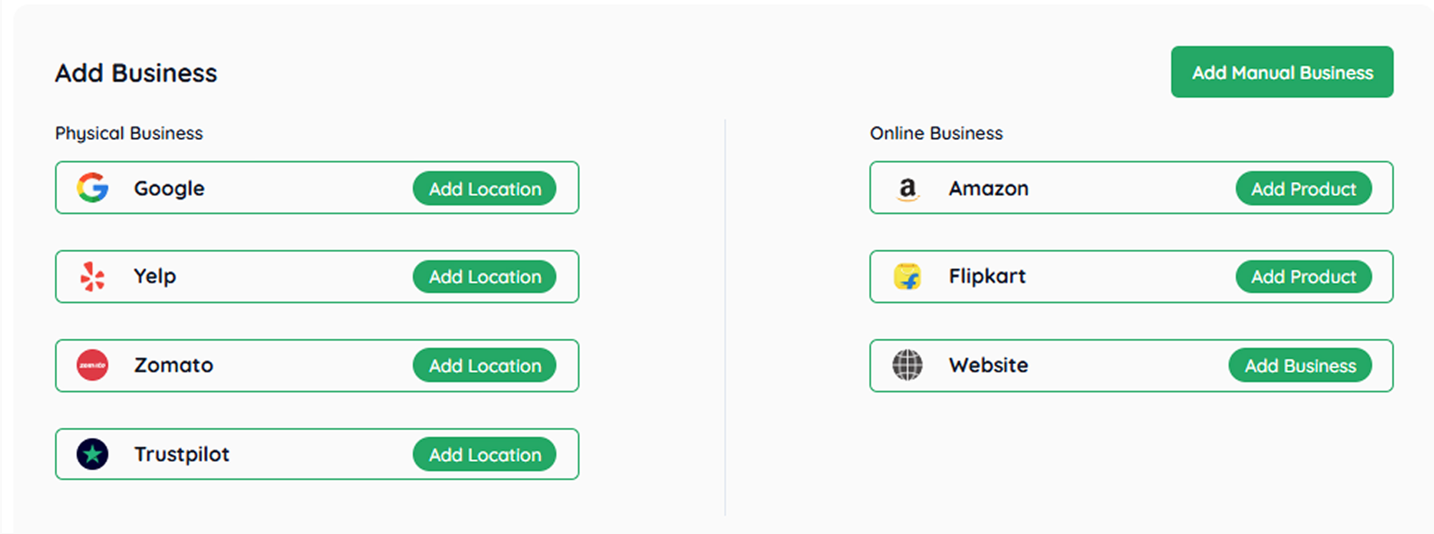 - For a physical business, you can add the location through Google, Yelp, Zomato, and Trustpilot by clicking on "Add Location."