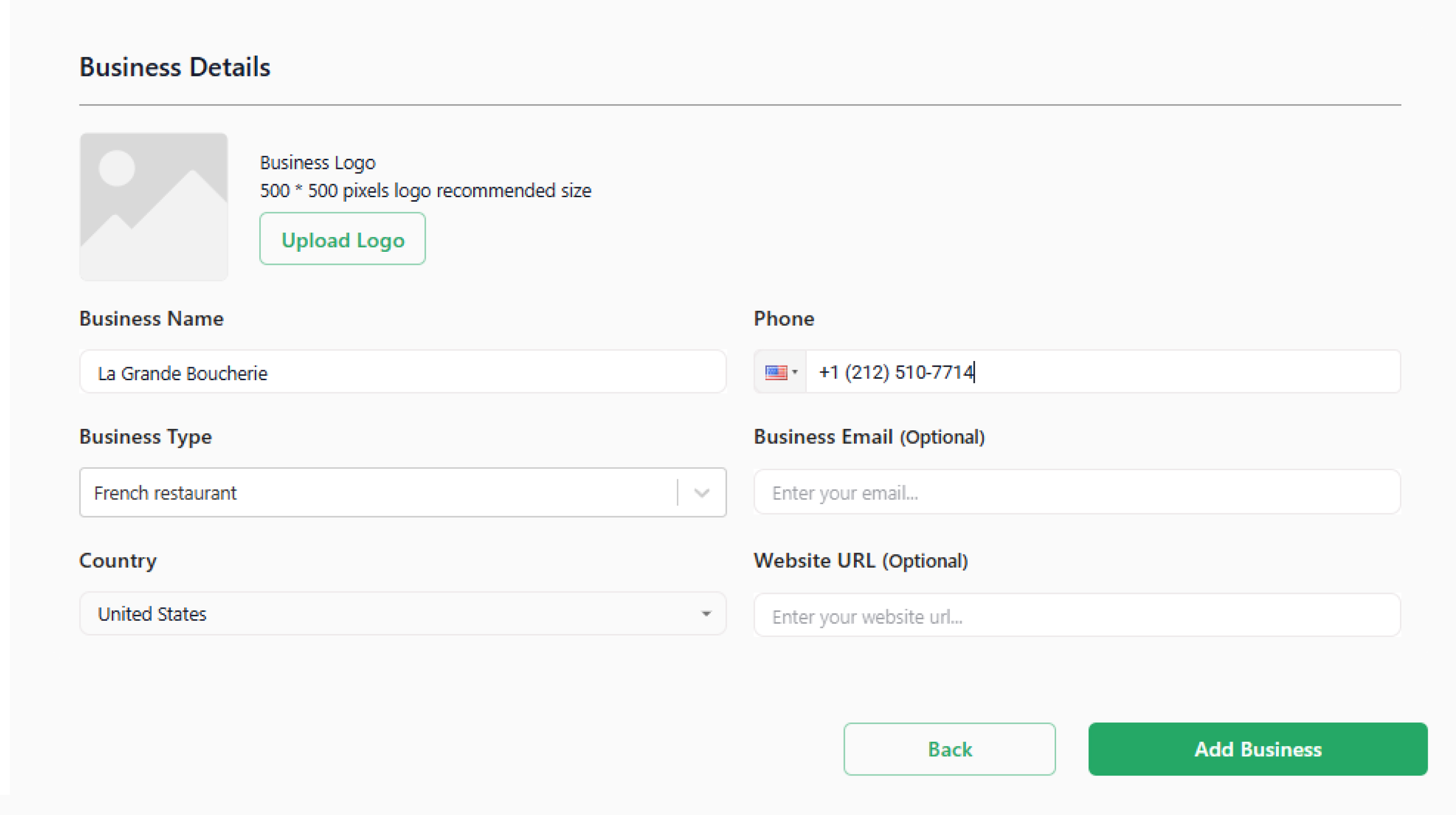- Add "Business Details." (Business name, type, country, phone number, email)